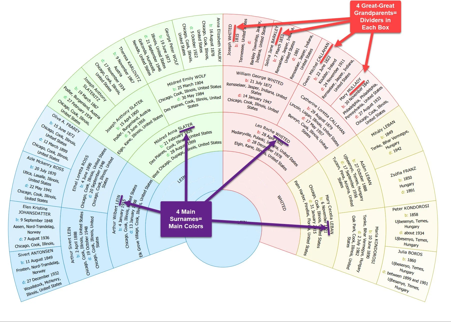 Pedigree chart showing the four colors and then the names used for the four sections.