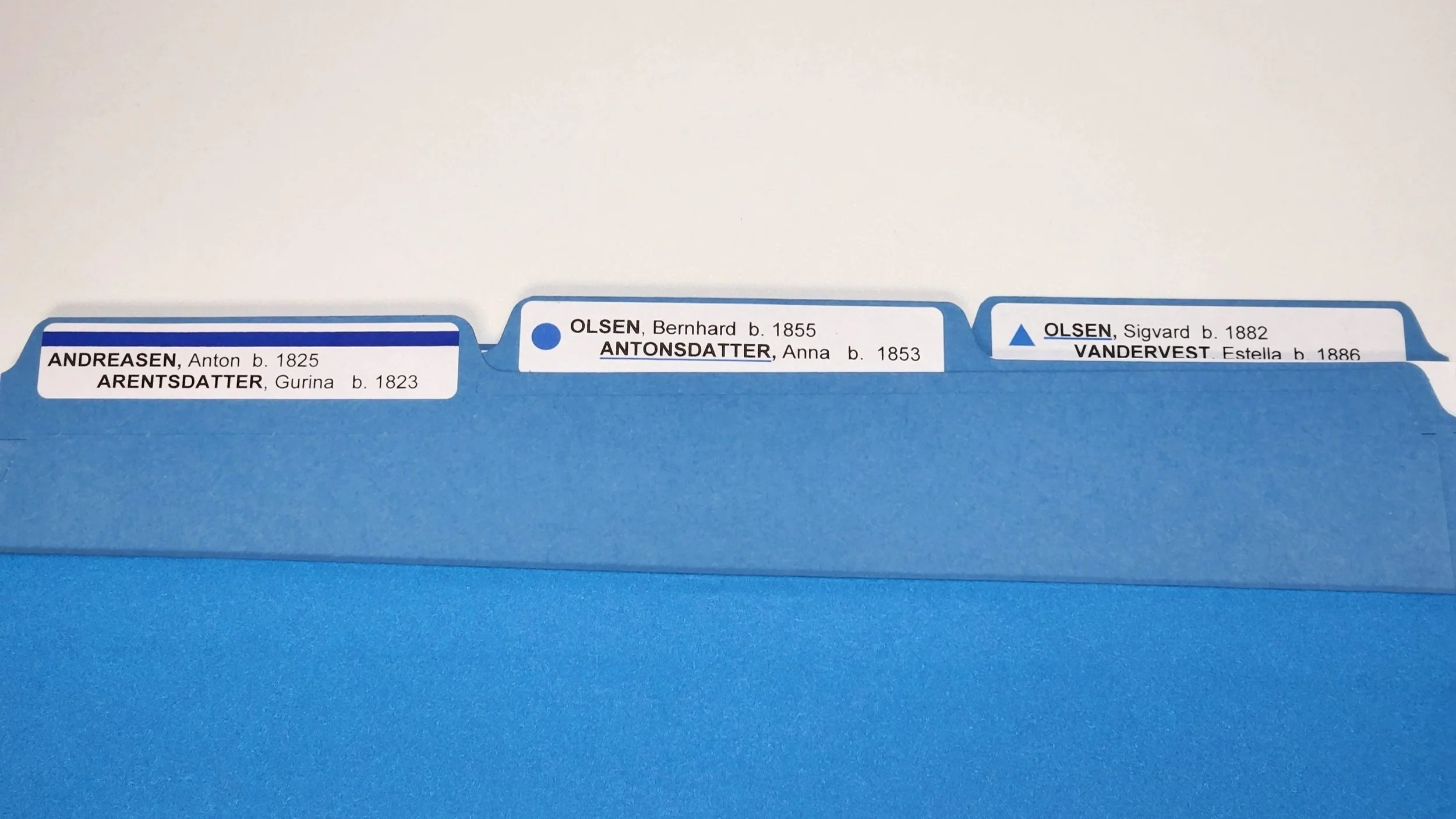 I purchased colored files so at a glance if I have a folder out I know which family it belongs to. And more importantly, I liked the way it looked.